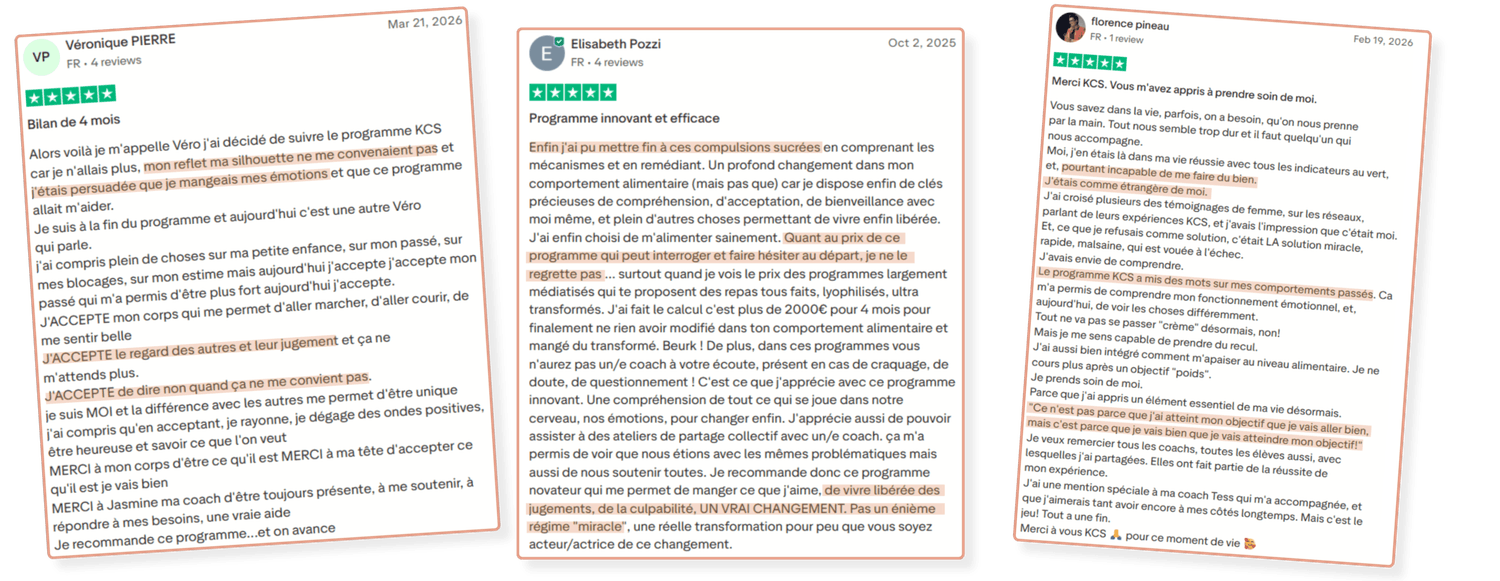 Cette méthode a démontré son efficacité pour perdre de la graisse tout en préservant sa santé. Son application est très efficace, mais peut parfois être challengeante à appréhender seule. C'est la raison pour laquelle nous avons mis en place un accompagnement personnalisé pour simplifier ces étapes. Vous pouvez retrouver plus de détails dans la vidéo et dans le guide que nous vous avons fait parvenir par e-mail. Et si vous souhaitez vous libérer pour de bon de ces kilos « en trop », réservez un Bilan Offert avec un Coach de l'équipe Kiné Coach Santé. Si la méthode est adaptée pour vous, il vous proposera un accompagnement personnalisé.